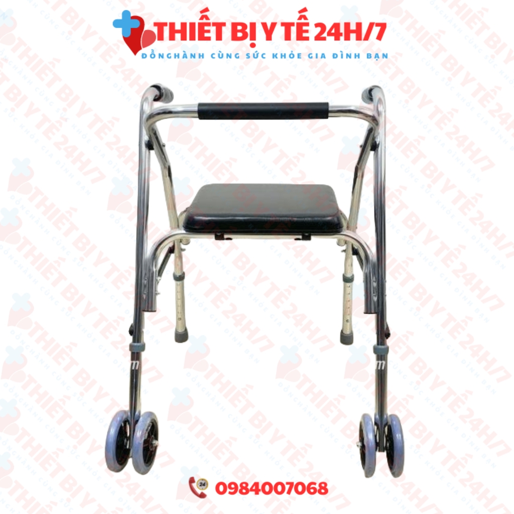 - Khung tập đi có bánh xe thiết kế 4 bánh kép phía trước, giúp việc di chuyển của người già/ người bệnh linh hoạt, thuận tiện hơn.