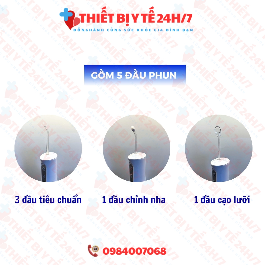 - Đầu phun kèm: đầu tiêu chuẩn, đầu cạo lưỡi, đầu chỉnh nha