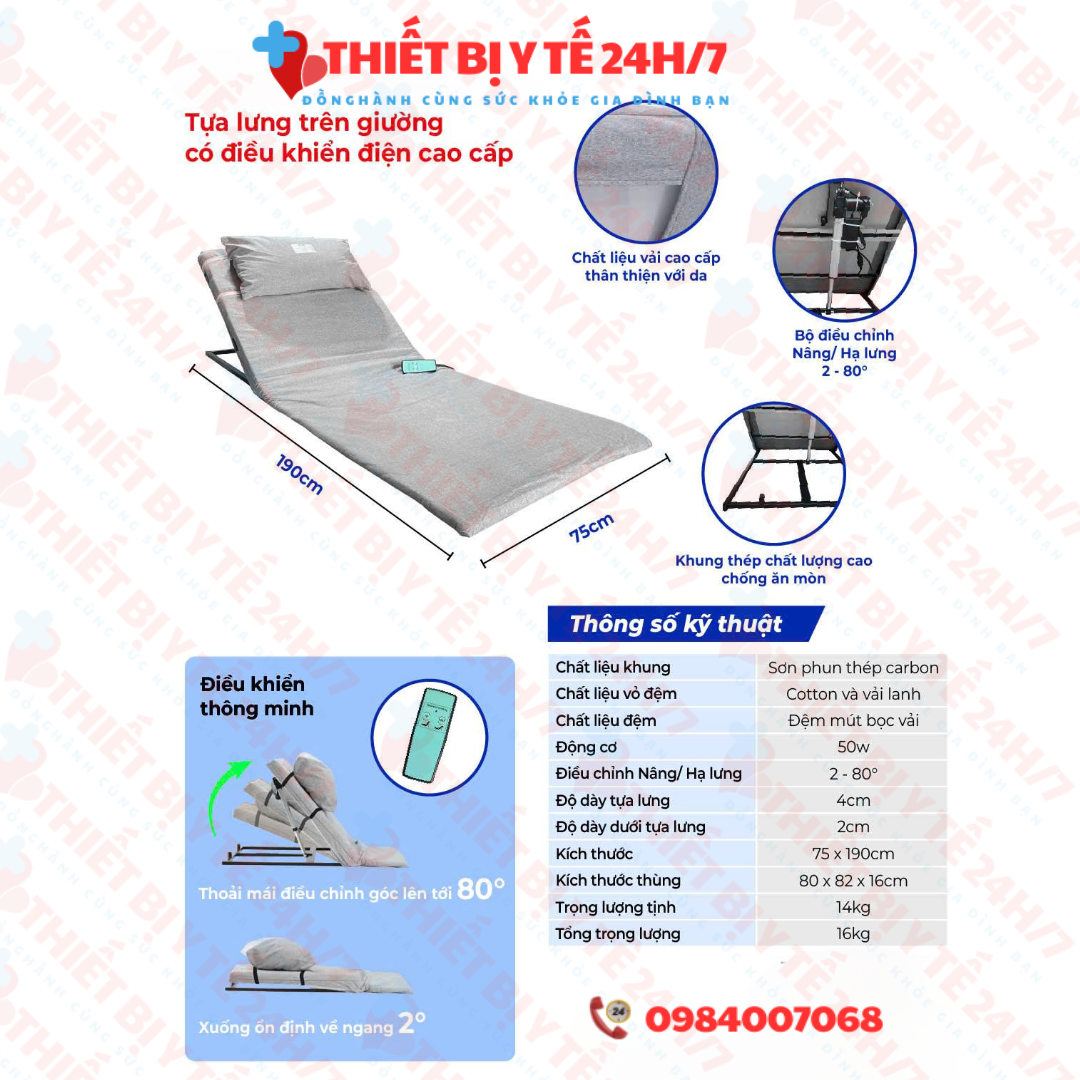 Tấm tựa lưng cao cấp có tay điều khiển giúp người dùng nâng lưng lên, hạ lưng xuống dễ dàng. Điều khiển từ xa cầm tay, thiết kế tiện lợi mang lại sự trợ giúp tốt nhất cho bệnh nhân. Tựa lưng giường nâng điện thông qua điều khiển. Cho phép người dùng dễ dàng điều chỉnh vị trí của giường chỉ bằng một nút nhấn, tạm dừng góc chọn tùy ý, dễ dàng điều chỉnh góc thoải mái. Tấm tựa lưng có kích thước tương đương mặt đệm đơn (190cm x 75cm). Bạn có thể đặt tấm tựa lưng có điều khiển điện ngay vào giường của người bệnh, người già yếu và sử dụng luôn.
