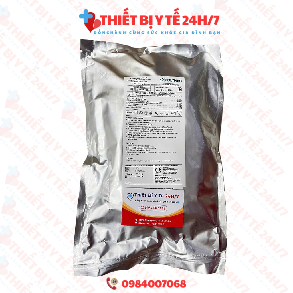 - Thành phần: Bên trong có dung dịch chống đông máu như CPDA-1 (Citrate Phosphate Dextrose Adenine) để ngăn máu đông.