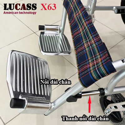 Đặc biệt, xe lăn Lucass X63 có bộ phận nối dài để chân, nếu muốn để chân dịch ra xa hơn thì dùng thanh nối dài để chân, không dùng thì tháo ra cất đi